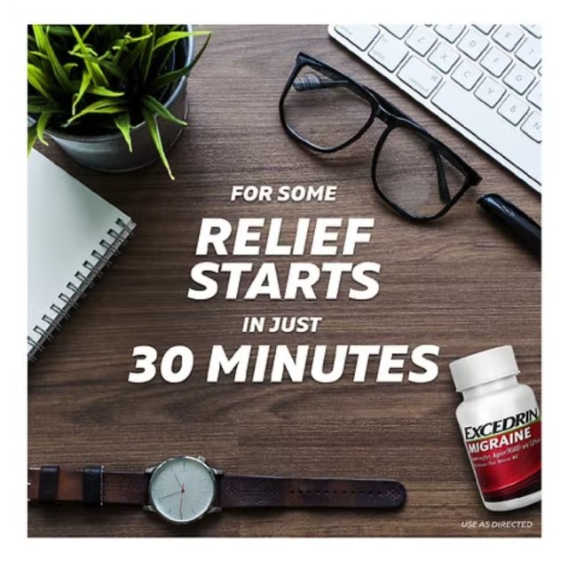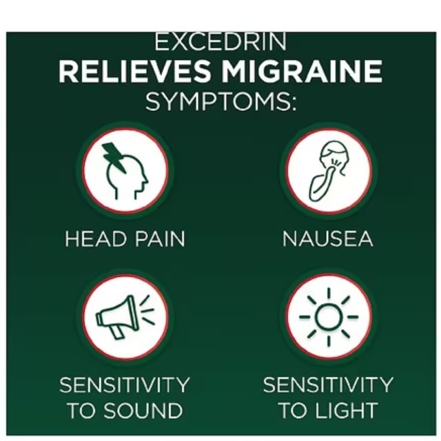 تسکین درد میگرن Excedrin با ترکیبی منحصر به فرد از مواد به کاهش درد، حساسیت به صدا و نور و حالت تهوع کمک می کند. استامینوفن ناراحتی را تسکین می دهد، در حالی که داروی ضد التهابی غیر استروئیدی (NSAID)، آسپرین، با درد و التهاب مبارزه می کند. فرمول کامل کافئین است که عملکرد استامینوفن و آسپرین را تقویت می کند.