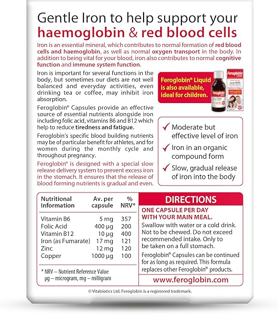 کپسولهای فروگلوبین با رهایش آهسته ویتابیوتیکس حاوی آهن، روی، مس و ویتامینهای گروه B هستند. آهن موجود در این کپسولها به حمایت از هموگلوبین و گلبولهای قرمز خون و همچنین مواد معدنی ضروری که به تشکیل طبیعی گلبولهای قرمز و هموگلوبین و انتقال طبیعی اکسیژن در بدن، کمک میکند. این کپسولها منبع مؤثری از مواد مغذی ضروری از جمله اسید فولیک، ویتامین B6 و B12 و آهن را فراهم میکنند که به کاهش خستگی و کوفتگی کمک میکند.