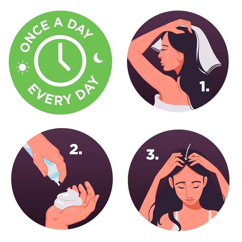 - استفاده آسان روزانه: روزی یک بار، نصف درب بطری از فوم ماینوکسیدیل ۵٪ بدون بو و بدون مواد مضر را مستقیماً روی پوست سر خود بمالید؛ برای نتایج مداوم، آن را در برنامه روزانه مراقبت از موی خود بگنجانید.