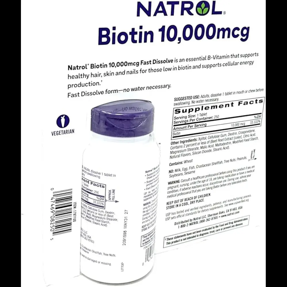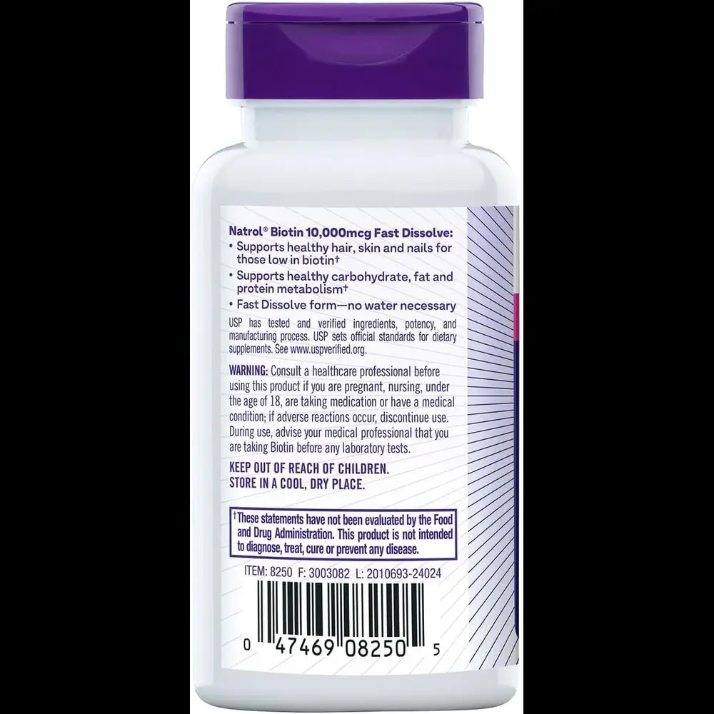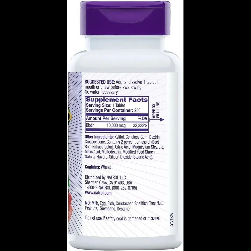 قرصهای حلشونده سریع بیوتین Natrol از مو، پوست و ناخنهای سالم برای افراد کم بیوتین حمایت میکنند. آنها همچنین به متابولیسم انرژی کمک میکنند و به تبدیل غذا به انرژی کمک میکنند