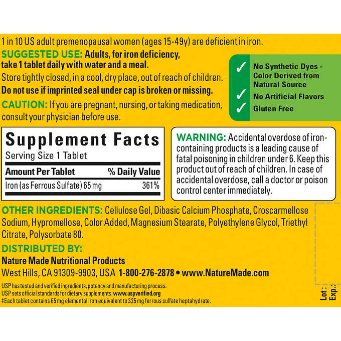 مکمل حمایت کننده آهن: حاوی یک بطری 365 عددی Nature Made Iron 65 میلی گرم (325 میلی گرم سولفات آهن)