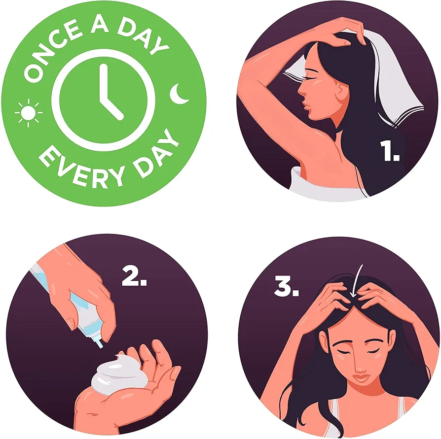 استفاده آسان روزانه: روزی یک بار، نصف درب بطری از فوم ماینوکسیدیل ۵٪ بدون بو و بدون مواد مضر را مستقیماً روی پوست سر خود بمالید؛ برای نتایج مداوم، آن را در برنامه روزانه مراقبت از موی خود بگنجانید.