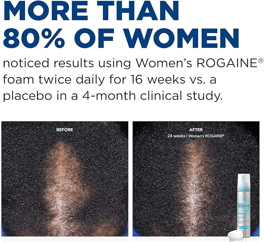 نتایج بالینی اثباتشده: از نظر بالینی ثابت شده است که روگین در زنان بالغ مبتلا به ریزش موی ارثی، موهایی را که ۴۸٪ ضخیمتر هستند، دوباره رشد میدهد؛ این نتایج با آزمایشهای فاز ۳ منتشر شده که فوم ۵٪ را در مقابل محلول ۲٪ در ریزش موی الگوی زنانه مقایسه میکنند، تأیید شده است.