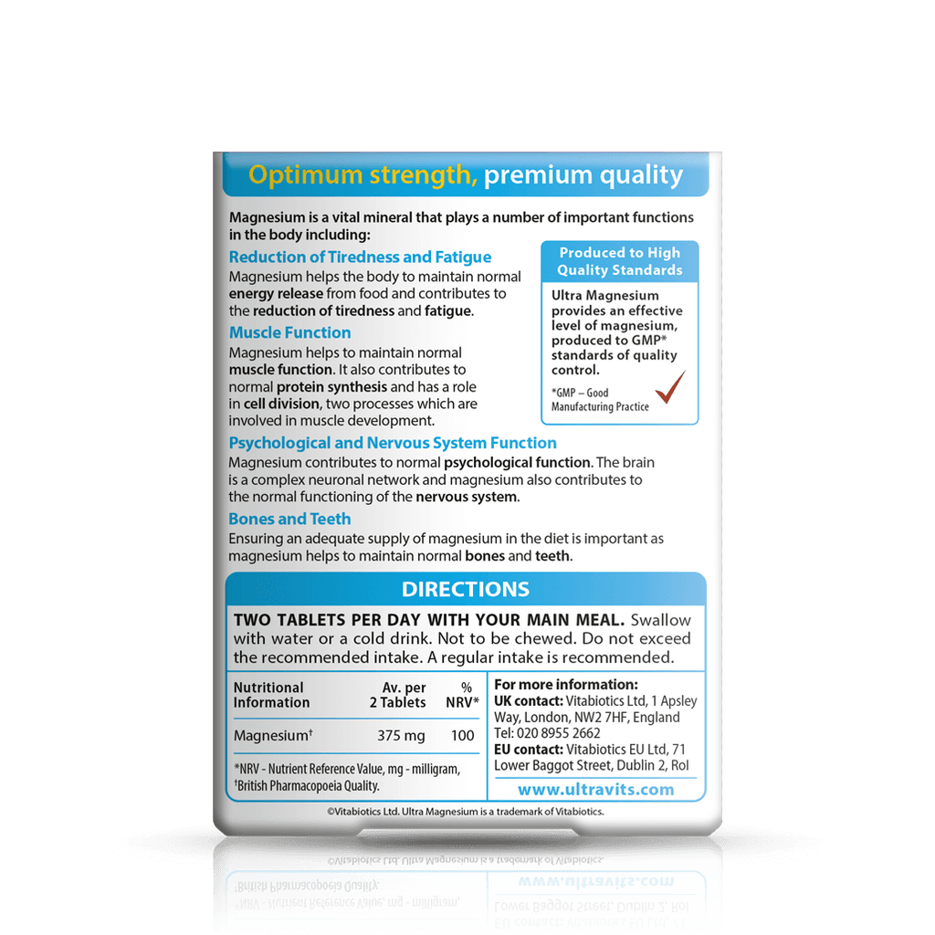 فرمول Ultra Magnesium فاقد رنگ مصنوعی و مواد نگهدارنده بوده و مطابق با استانداردهای بالای کنترل کیفیت شرکت Vitabiotics در انگلستان تولید میشود