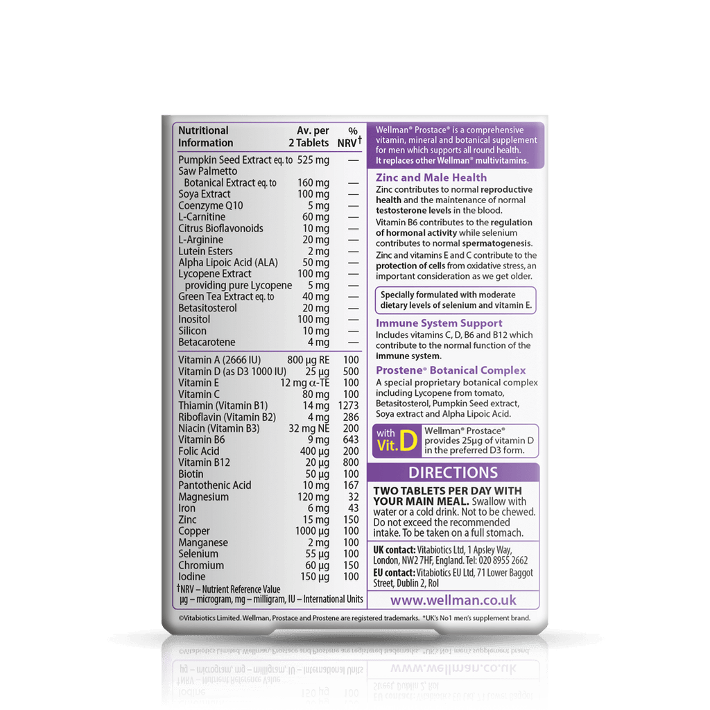 ولمن پروستاس بیش از 30 ماده مغذی را فراهم می کند که ترکیبی از ویتامین ها، مواد معدنی و اسیدهای آمینه است. روی به باروری طبیعی و سلامت باروری کمک می کند و به حفظ سطح طبیعی تستوسترون در خون کمک می کند. سطح کل روی در پروستات 10 برابر بیشتر از سایر بافت های نرم است. سطوح بالای کافئین، سیگار کشیدن، استرس و الکل باعث کاهش سطح روی در بدن می شود. عواملی مانند چای و مصرف بالای فیبر نیز ممکن است مانع از جذب این ماده معدنی مهم شود.